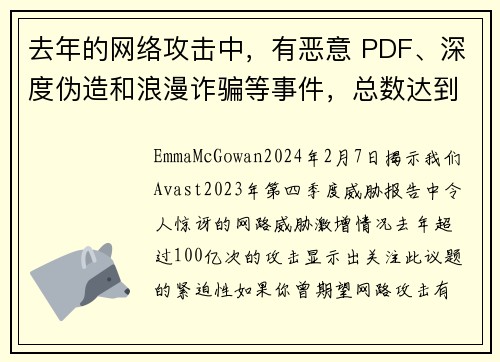 揭示我们Avast 2023年第四季度威胁报告中令人惊讶的网路威胁激增情况。去年超过100亿次的攻击显示出关注此议题的紧迫性。